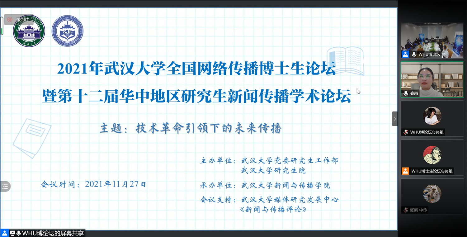 11月27日,“2021年武汉大学全国网络传播博士生论坛”暨“第十二届华中地区研究生新闻传播学术论坛”在武汉大学新闻与传播学院成功举办。