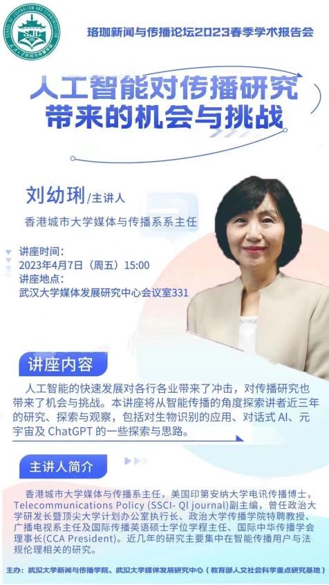 随后,刘幼琍教授在武汉大学媒体发展研究中心331会议室,开讲题为《人工智能对传播研究带来的机会和挑战》的讲座。讲座由吴世文教授主持。