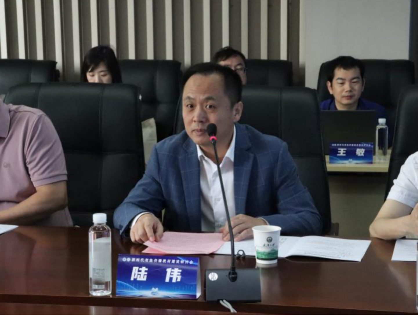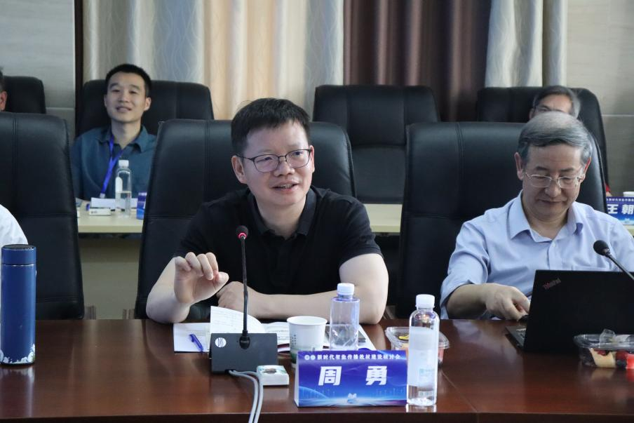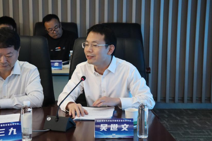 武汉大学新闻与传播学院副院长(主持工作)吴世文教授简要介绍武汉大学新闻与传播学院成立以来的发展,强调学院对教材编写工作的高度重视,表示本次新时代智能传播教材建设研讨会是对中国新闻传播学自主知识体系建设的重要探索。